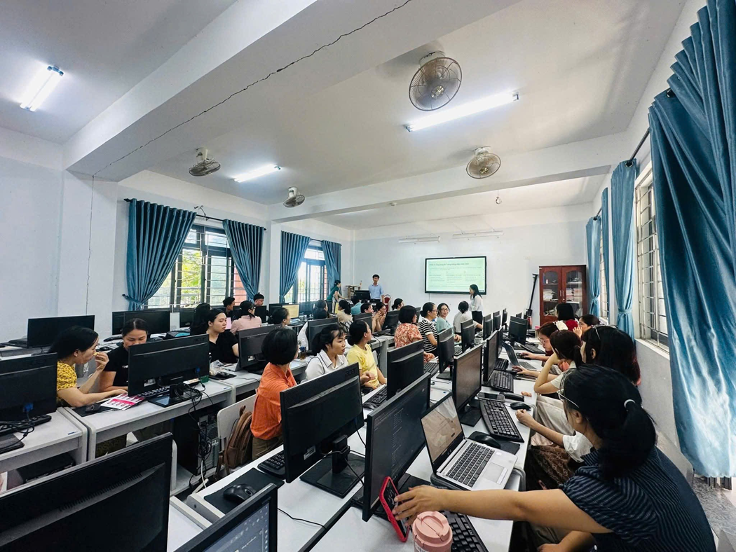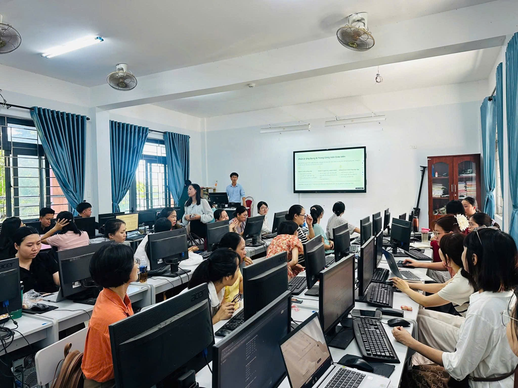 💻 Buổi tập huấn được tổ chức tại phòng Tin học với sự tham gia đầy đủ của các thầy cô. Dưới sự hướng dẫn của báo cáo viên, giáo viên được tìm hiểu và trải nghiệm nhiều công cụ AI hữu ích, có thể hỗ trợ trong việc thiết kế bài giảng, đổi mới phương pháp dạy học, kiểm tra – đánh giá và nâng cao hiệu quả công việc.