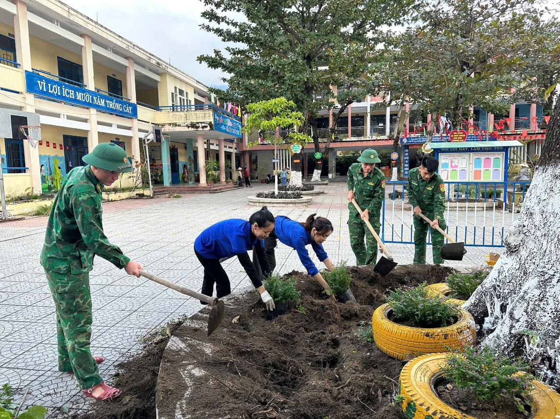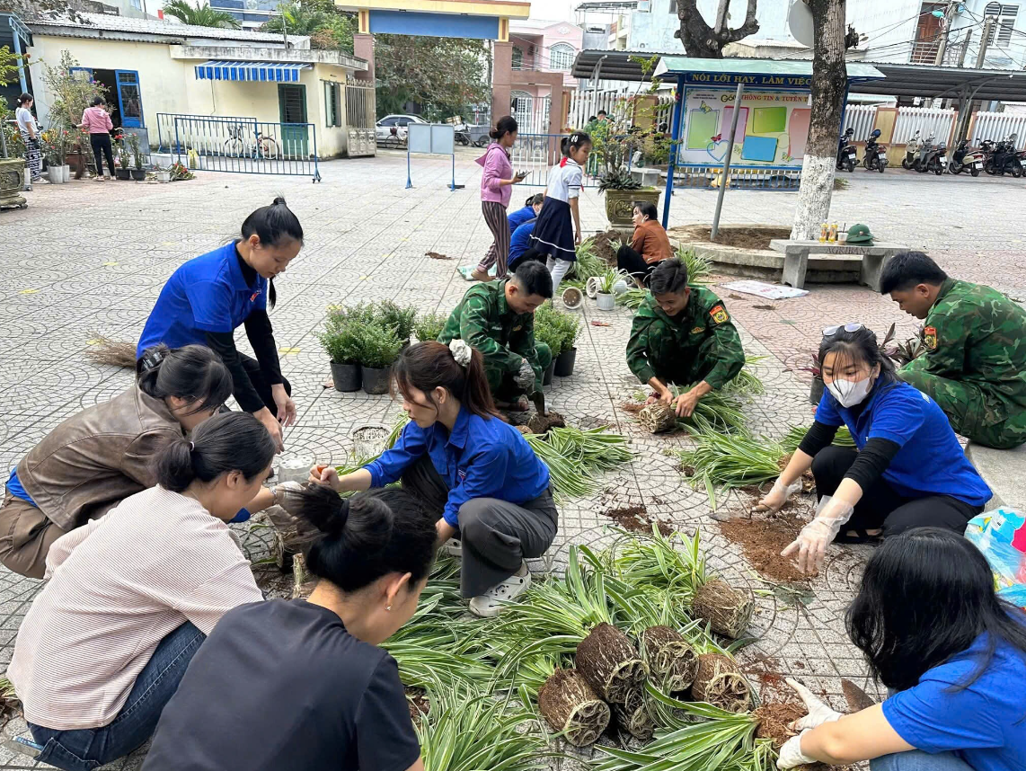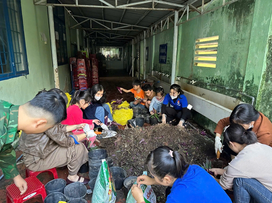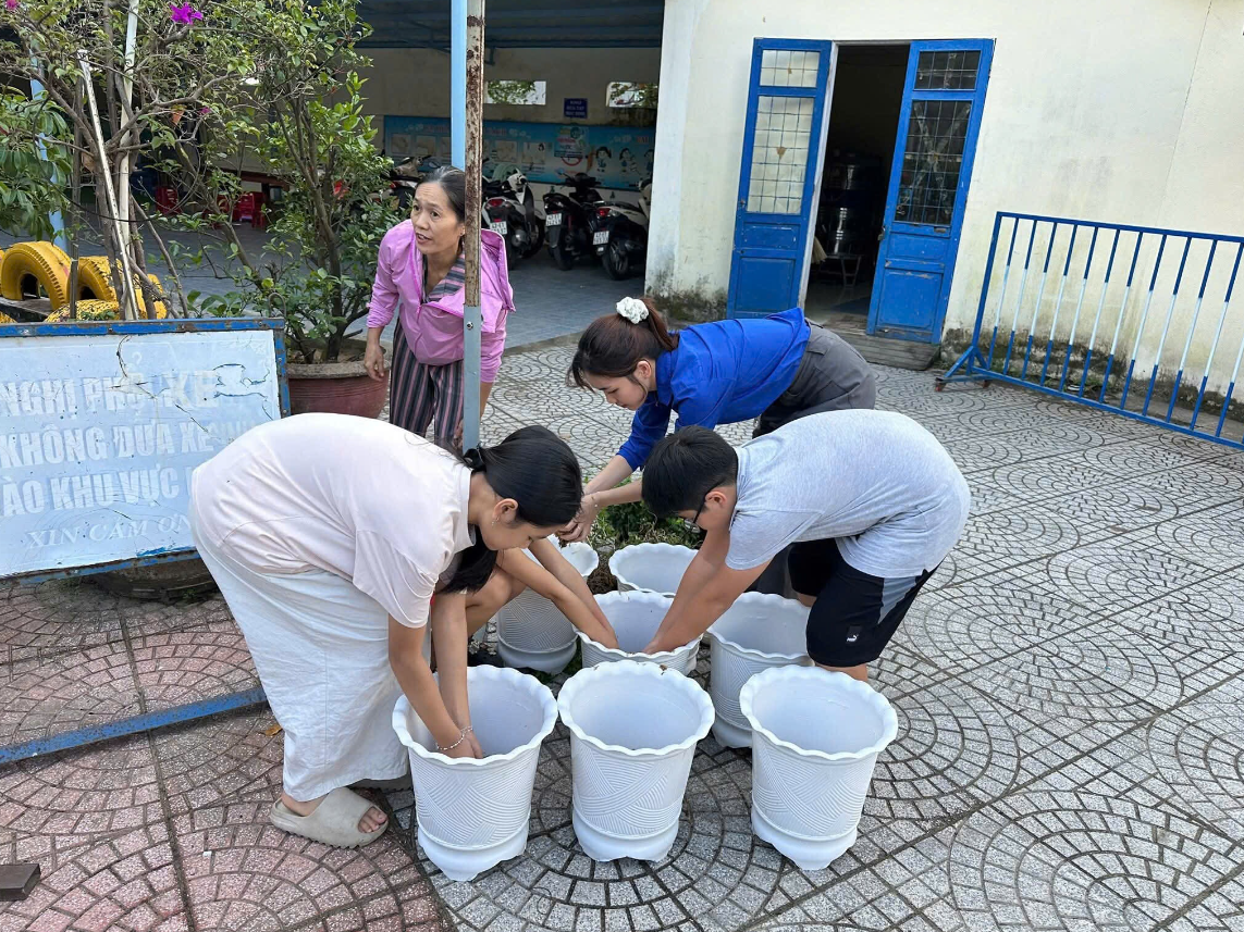 Từ những vật liệu tái chế quen thuộc, đoàn viên, giáo viên và học sinh cùng nhau sáng tạo chậu hoa xinh xắn, vun trồng và chăm sóc cây xanh, mang đến diện mạo tươi mới cho không gian học tập.