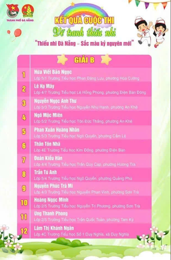 Kết quả cuộc thi vẽ tranh thiếu nhi cấp thành phố chủ đề “Thiếu nhi Đà Nẵng - Sắc màu kỉ nguyên mới”. Chúc mừng em Nguyễn Phúc Trà Mi đạt giải B với bức tranh với chủ đề: “Em ước mơ trở thành Đoàn viên”. ❤️🌻