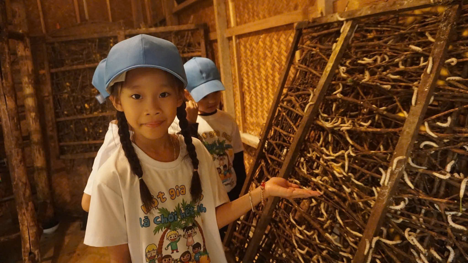 Tiếp đó, đoàn di chuyển đến Làng lụa Hội An để tham quan và trải nghiệm các hoạt động tìm hiểu nghề dệt lụa truyền thống. Các em được quan sát quy trình nuôi tằm, kéo tơ, dệt lụa và tham gia các trò chơi tập thể, giúp tăng cường kỹ năng giao tiếp, hợp tác và tinh thần đoàn kết.